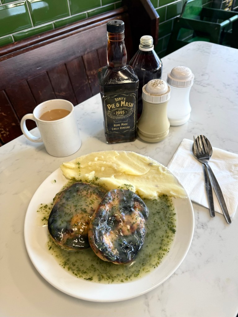 I’m from West London. I didn’t grow up eating this style of pie & mash. I completely understand the criticism it gets. It’s a bland dish and doesn’t look great either – the liquor (thick green parsley sauce) can be off-putting to some. That said, I’ve grown pretty fond of the dish over the past few years. I’ve even started liking the way it looks… and once hit with the right amount of salt, pepper and chilli vinegar maybe it doesn’t taste so bland. I’ve always been a big fan of greasy spoons and chippies with dated decor and I feel the same way about pie & mash shops so it’s only right that I’m drawn to pie & mash shops too. A lot of these places are over a hundred years old. It feels like you’re stepping back in time when you enter them. I love the small wooden benches and marble tables. When you eat pie & mash it feels like you’re eating part of London’s history. Even though there are a lot more exciting things to eat in London these, I urge people to have a pie & mash now and again to help keep these places alive and preserve a piece of history.