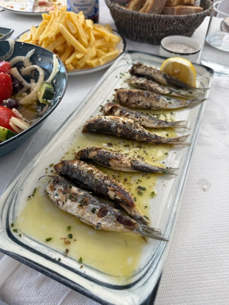 📍Kampi. You’ll find this seafood restaurant overlooking the bay of Kampi. As mentioned before there are not many highly rated seafood restaurants on the island but this is one. Unfortunately when we went they only had very large fish available (two big for two people) so we just went for sardines instead. They serve Alfa beer with seasalt here which is worth a try too.