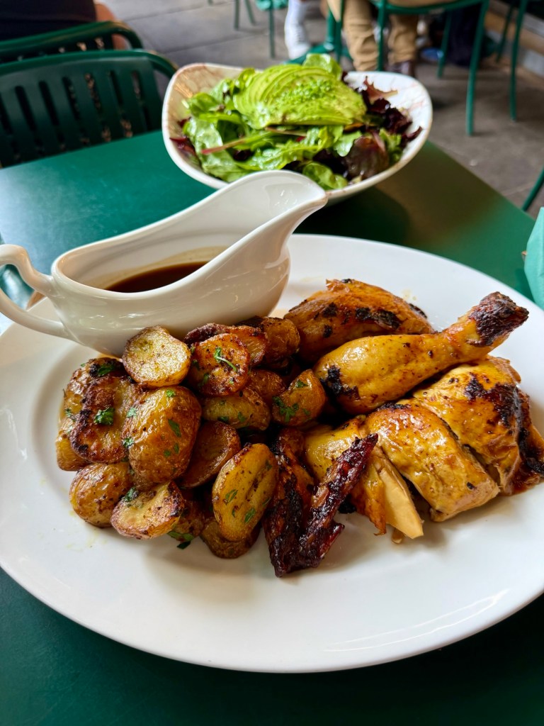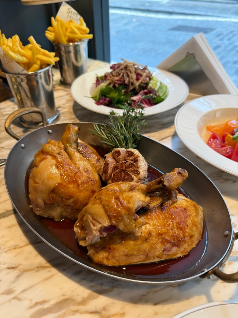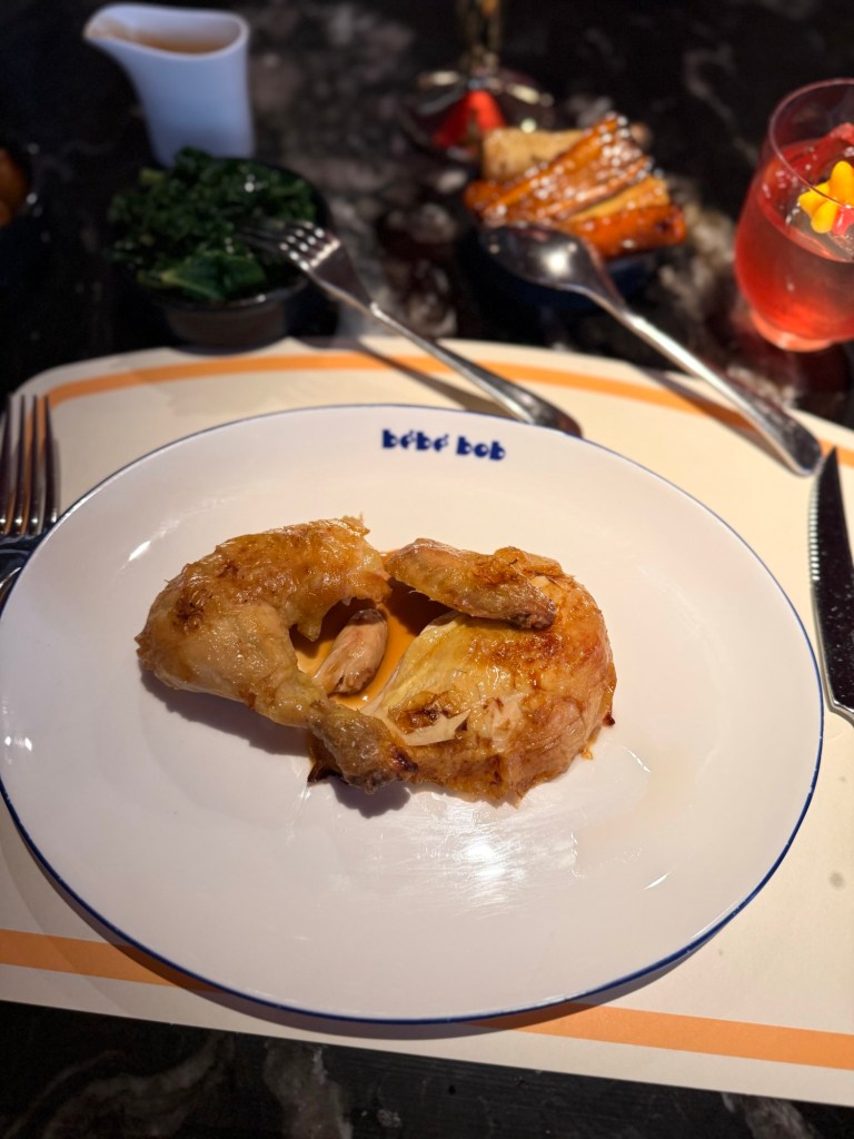 📍Soho. Bebe Bob is the younger sister restaurant of Soho institution, Bob Bob Ricard. They’re known for their martinis, champagne, caviar bumps, and chicken. The service is impeccable and the vibe is great. It’s a perfect date spot. For the rotisserie chicken they use a French Label Rouge chicken from Vendee. It’s £24 for a half chicken (£48 for a whole). This is one of the only places on the list that manages to create a crispy skin on the chicken yet still maintaining such a soft, juicy, tender bird. Watch the reel here.