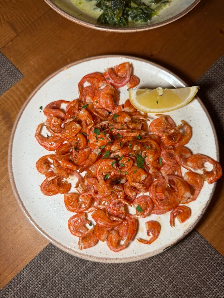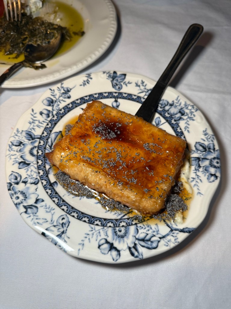 I liked this restaurant but I didn’t really love it. The horta, Symi shrimp and feta tempura dishes were really nice but I wasn’t a big fan of the shrimp orzo which had a very sweet sauce and rice cooked a little too al dente. They had a lamb orzo dish o would have gone for but I was put off my a precious white foam that came on top of it. Also be warned you have to go up a lot of steps to get here. Definitely don’t do it whilst carrying a two year old and a buggy at the same time – it will ruin your legs.
