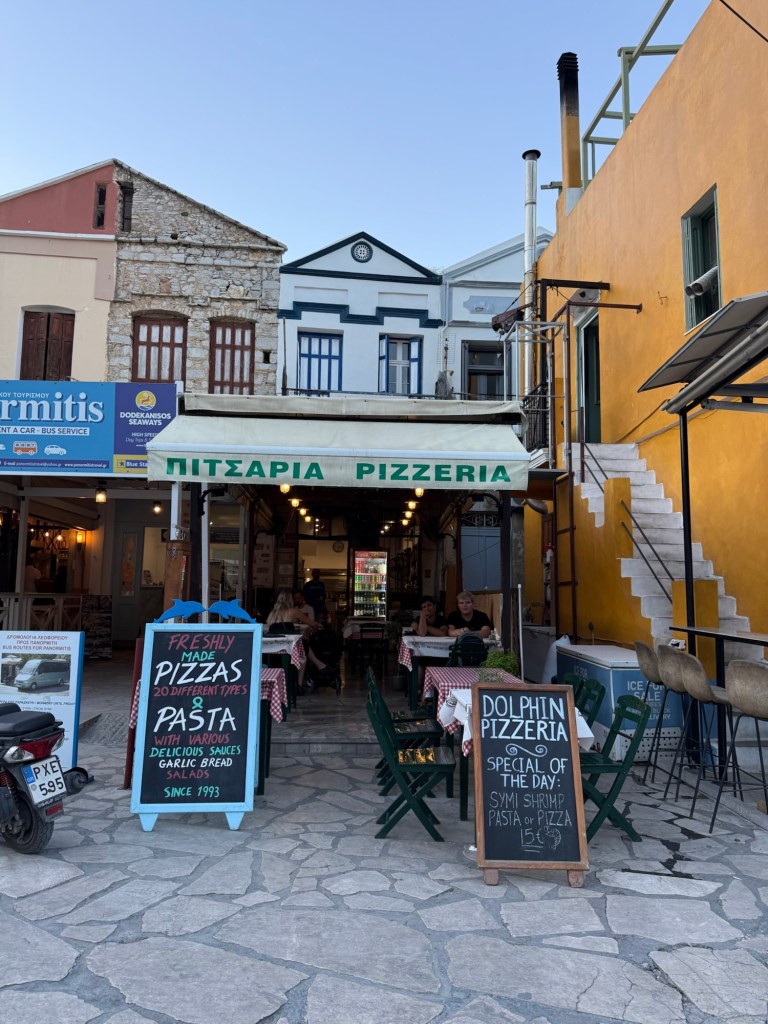 Dolphin Pizzeria bit of a cult-favourite on the island. It’s a family run business that has been going for thirty years. Pizzas start at €9 but I went for the Symi shrimp pizza for €15. It came with a tomato base, cheese, peppers, red onions and crispy Symi shrimp. They have a lovely sweet and salty flavour. It’s a weird combination but it worked. See reel here.
